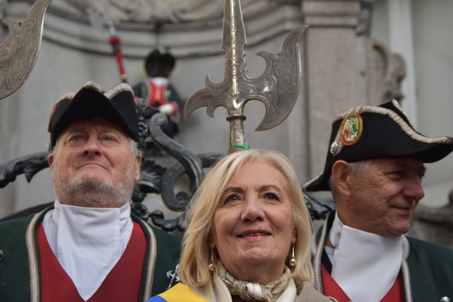 En ce vendredi 24 octobre 2025, le Cercle d’Histoire de Bruxelles offre un costume de Hallebardier de la Ville de Bruxelles, à Manneken-Pis.