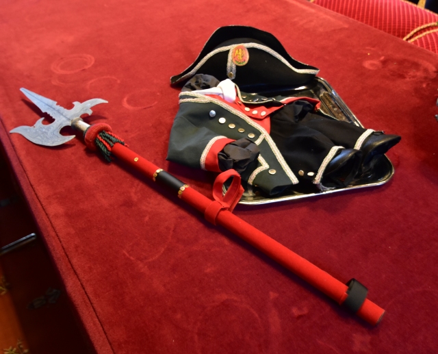 Certains, exerçant plutôt une fonction de « maître de cérémonie », tiennent une canne à pommeau d’argent orné d’une Vierge en majesté, appelée « brigadier »… j’imagine qu’il serait fort inopportun d’accompagner les futurs mariés à l’autel (si j’ose dire) avec une arme de guerre, comme si leur seule présence en ces lieux les empêcherait à tout jamais de dire « non » à la dernière minute… ce qui eut lieu à de rares occasions, comme lorsqu’un futur mari – sous la menace de la famille de sa fiancée – dû se rétracter à la dernière seconde ! Heureusement, l’Échevin avait été prévenu, ce qui permit de modérer les troubles qui s’en suivirent et les Hallebardiers ne durent pas faire usage de leurs armes… qu’ils et elles se feront un plaisir de vous laisser admirer en détail lors du drink.